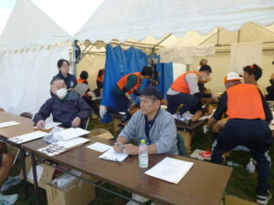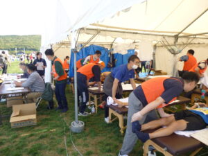 今年は3㎞・5㎞コースのランナーが来ることも多く、下肢、腰部、体幹の痛みの訴えが大半でしたが、中には筋疲労・脱水などからくる筋痙攣をおこすランナーもいて、隣接する医療救護ブースの医師や、看護師と連携をとりながら、こちらも過去最高の315名に対するケアとなりました。