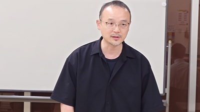会場入り口                開講の挨拶をする傅法谷総務部長